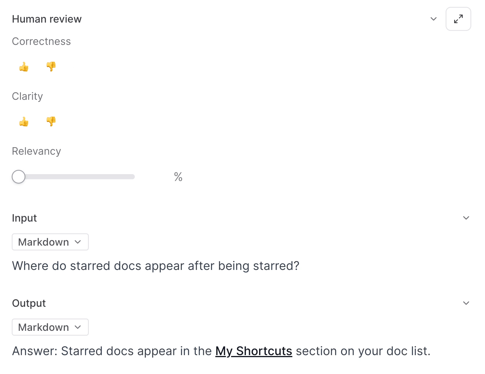 If you or a subject matter expert is reviewing a large number of logs, you can use the "review" mode to enter a UI that's optimized specifically for review. To enter review mode, hit the "r" key or the expand () icon next to the "Human review" header.